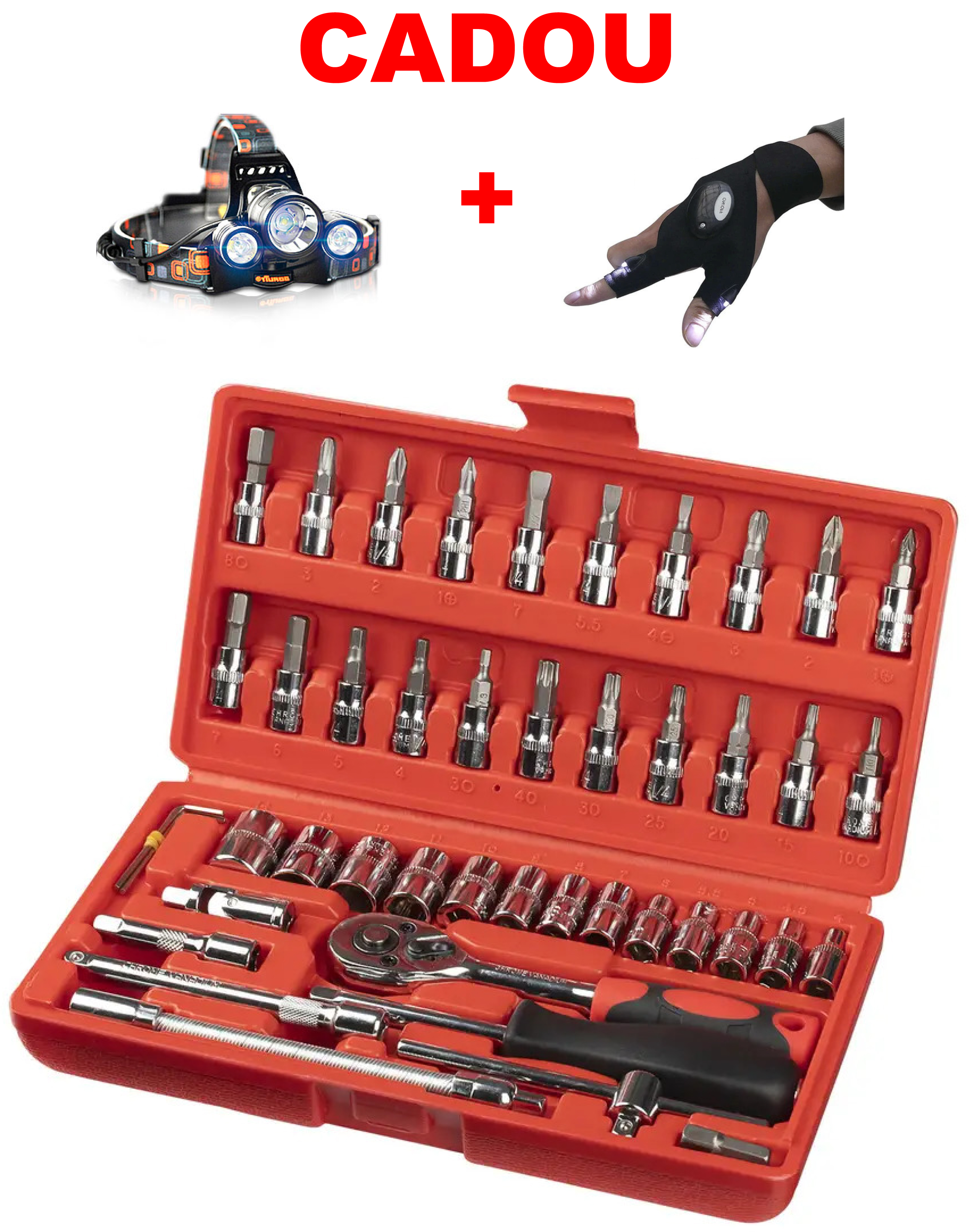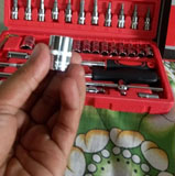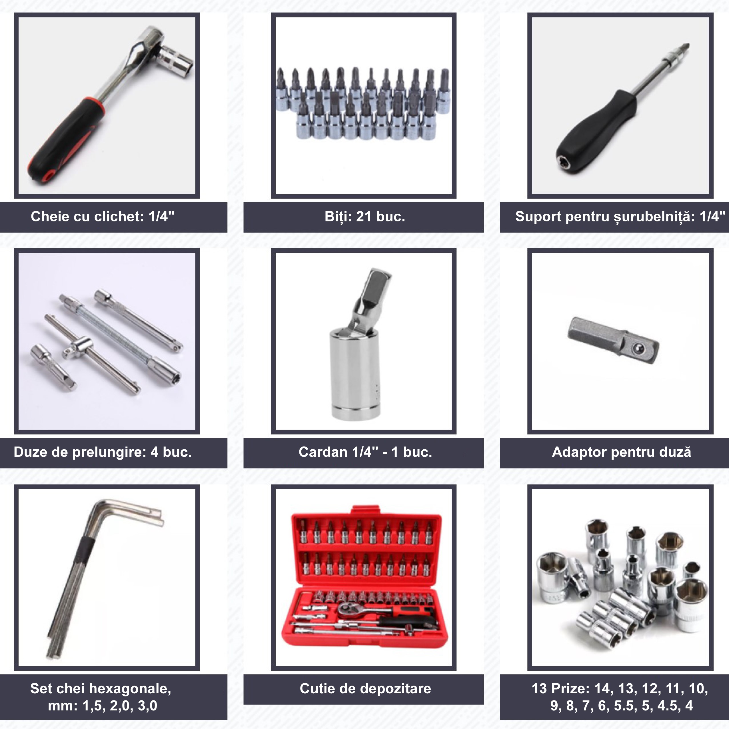 Setul este compus din 46 de piese care conține cele mai importate instrumente pentru orice însărcinare și sunt depozitate într-o carcasă rezistentă la impact.